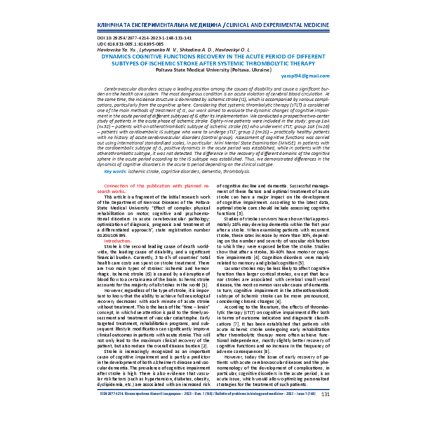 Stroke is the second leading cause of death worldwide, the leading cause of disability, and a significant financial burden. Currently, 3 to 4% of the total health care costs of countries are spent on stroke treatment. Studies of stroke survivors have shown that approximately 10% may develop dementia within the first year after a stroke. However, today the issue of early recovery of patients with acute cerebrovascular diseases and the phenomenology of the development of complications, in particular cognitive disorders in the acute period, is an acute issue, which would allow optimizing personalized strategies for the treatment of such patients. The goal is to evaluate the dynamic changes in the cognitive sphere in patients in the acute II period with atherothrombotic and cardioembolic subtypes after thrombolysis. We conducted a prospective two-center study of patients in the acute phase of ischemic stroke. 89 patients were included in the study: group 1aA (n=32) – patients with atherothrombotic subtype of ischemic stroke (IS), who were subject to thrombolytic therapy (sTLT); group 1aK (n=16) – patients with cardioembolic subtype IS who were to undergo sTLT; group 2 (n=20) –healthy patients with no history of acute cerebrovascular disorders (control group). Assessment of cognitive functions was carried out using international standardized scales, in particular: Mini Mental State Examination (MMSE). We established statistically significant differences between the examined groups for 1 day according to indicators of time orientation (р=0.007), attention and calculation (р<0.001), perception and memory (р=0.001) and the total MMSE score (р<0.001). Statistically significant differences were found between the examined groups on the 14th day in the indicators of attention and calculation (p<0.001) and in the total MMSE score (p<0.001). No significant differences in ∆MMSE were found between groups 1aA and 1aK (р=0.701). In patients with cardioembolic subtype IS, the presence of positive dynamics in the acute period was established, while in patients with atherothrombotic subtype it was not detected. Along with this, the difference in recovery of various domains of the cognitive sphere in the acute period according to subtype IS was noted. This is how we discovered. that the dynamic changes of cognitive functions in the acute IS period after sTLT vary depending on the clinical subtype.