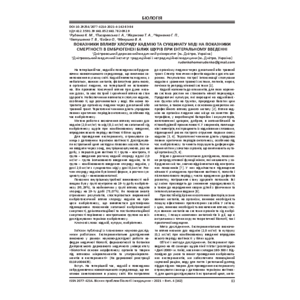 ПОКАЗНИКИ ВПЛИВУ ХЛОРИДУ КАДМІЮ ТА СУКЦИНАТУ МІДІ НА ПОКАЗНИКИ СМЕРТНОСТІ В ЕМБРІОГЕНЕЗІ БІЛИХ ЩУРІВ ПРИ ЕНТЕРАЛЬНОМУ ВВЕДЕННІ