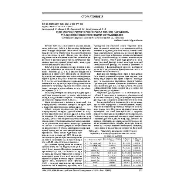 Резюме. Система мікроциркуляції є основною ланкою, що забезпечує метаболічний гомеостаз в органах і тканинах, а обмінні порушення в організмі, в свою чергу, впливають на структурно-функціональні характеристики судин мікроциркуляторного русла, в тому числі в тканинах пародонта. Актуальність дослідження мікроциркуляції визначається тим, що за характером її порушень можна встановити початкову стадію патологічних змін в органах і тканинах, а також вибрати тактику хірургічного лікування. Лазерна допплерівська флоуметрія (ЛДФ) один з найбільш інформативних, чутливих, відтворюваних методів, що дозволяють оцінити стан мікроциркуляції в тканинах пародонта. Мета дослідження – визначення локального стану мікроциркуляції в тканинах пародонта методом ЛДФ у пацієнтів з одонтогенними кістами щелеп. Об’єкт і методи дослідження. Для оцінки стану мікроциркуляції методом ЛДФ обстежені 60 пацієнтів з одонтогенними кістами щелеп, в тому числі 26 чоловіків і 34 жінки. Середній вік пацієнтів склав 35,42±2,1 року. Дослідження проводилося на доопераційному етапі, на 7 та 30 добу після цистектомії. Запис кожної ЛДФ-грами проводився при температурі 22°С, з 10.00 по 11.00 годину ранку. Для оцінки параметрів мікроциркуляторного русла були взяті наступні показники: середня величина перфузії тканин кров’ю (ПМ), визначення рівня «флакса» (СКО) – середнє квадратичне відхилення коливань ПМ в заданому проміжку часу. За умов нормоциркуляторного типу мікроциркуляції тканин пародонта найнижчий зафіксований параметр в проекції одонтогенної кісти, де амплітуда ендотеліальних коливань AmaxE (Гц) = (0,120±0,005) в порівнянні з показниками інтактного пародонта AmaxE (Гц) = (0,210±0,032). Показники активних флаксомоцій мають схожу амплітуду, з різницею в ±0,008 Гц. На 7 добу спостереження у пацієнтів превалює гіперемічний тип мікроциркуляції. У 28% випадків при проведенні оперативного втручання спостерігається застійний тип мікроциркуляції. На 30 добу спостереження в обох групах зафіксований нормоциркуляторний, спастичний та гіперемічний типи мікроциркуляції, але кількість пацієнтів з нормоциркуляторним типом збільшується на 16%, а з гіперемічним – менша на 3%.